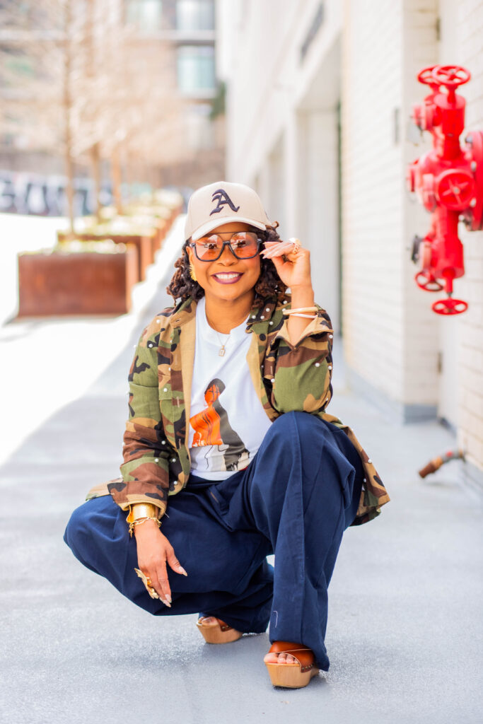 And the hair? Whew. Those curly locs tucked perfectly under the cap—shaped and styled by Jeylocs—bring texture, personality, and that undeniable “this is me” energy. It’s playful, it’s expressive, it’s rooted. Paired with pieces from Shein and Closet finds. My comfy yet statement-making cargo barrel pants (yes, the GLOURI Women’s High Waist Cargo Barrel Pants are giving effortless boss energy. My graphic tee that feels like a reflection of me (Women Round Neck Dreadlocks Print Tee, and of course the camo jacket that pulls it ALL together (GLOURI Camouflage Pearl Detail Shirt… because a little edge and a little sparkle never hurt anybody. Every piece plays its part.